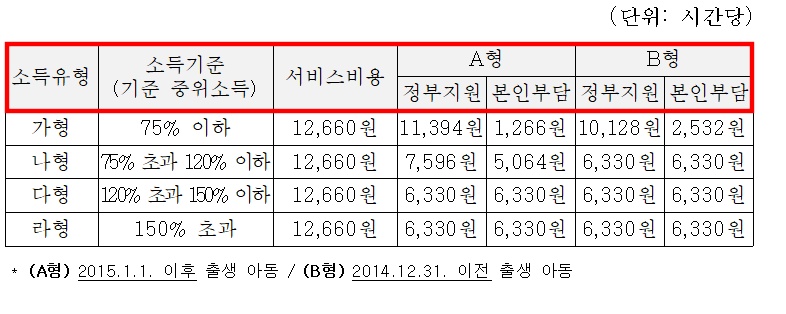 - 이용요금 : 서비스 "가~라" 유형과 미취학 아동, 취학 아동에 따라 본인 부담금이 시간당 1,899원~6,330원으로 다름