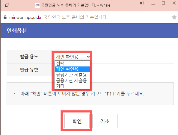 국민연금 가입증명서를 출력 시 발급 용도를 개인 확인용 , 공공기관 제출용 등에서 선택합니다.