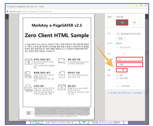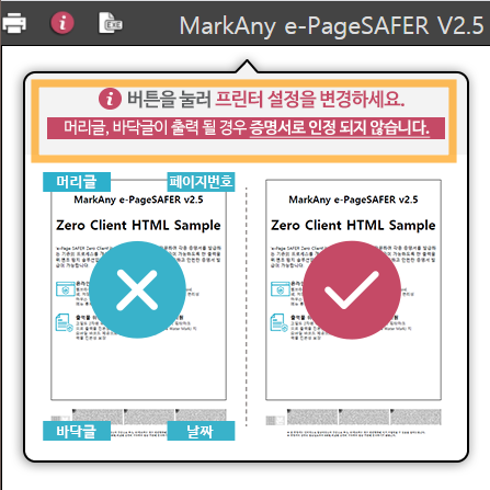 여기에서 프린터모양의 인쇄 버튼을 누르면 출력이 가능하며 머리글과 바닥글이 출력 시 증명서로 인정이 되지 않기 때문에 인쇄하기 전에 설정을 먼저 해야 합니다.