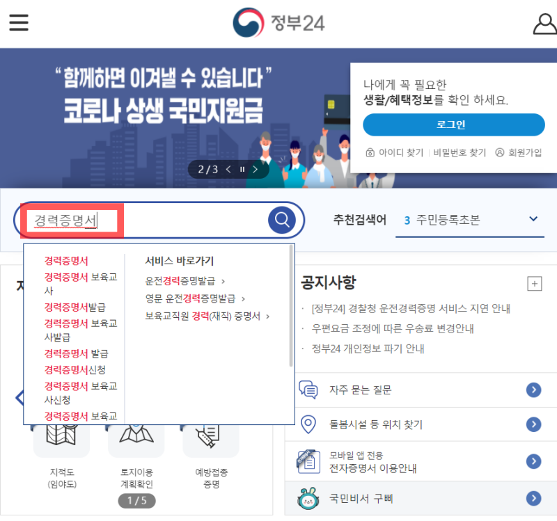 1) 정부 24 홈페이지 로그인 후 검색란에 경력증명서 입력