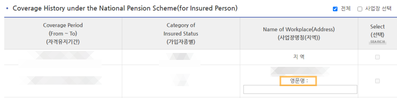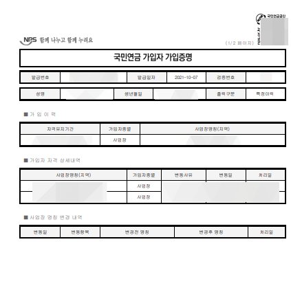 경력증명서로 활용가능한 국민연금 가입 영문증명서로 출력시 회사명만 영문으로 바꿔주시면 됩니다.