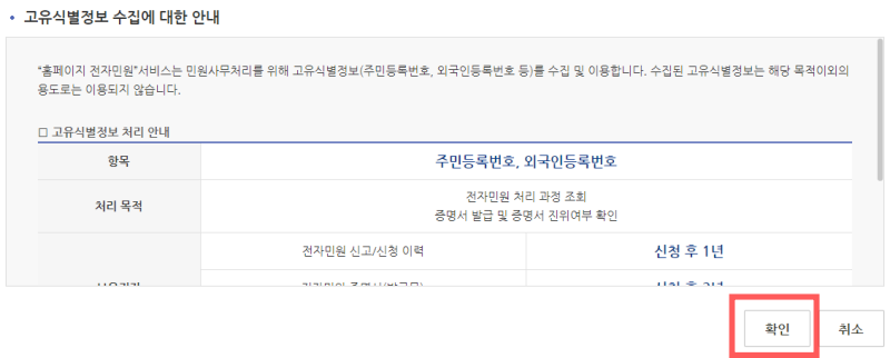 개인정보와 고유식별정보 수집에 대한 안내사항을 읽고 동의 한 후 확인을 누릅니다.