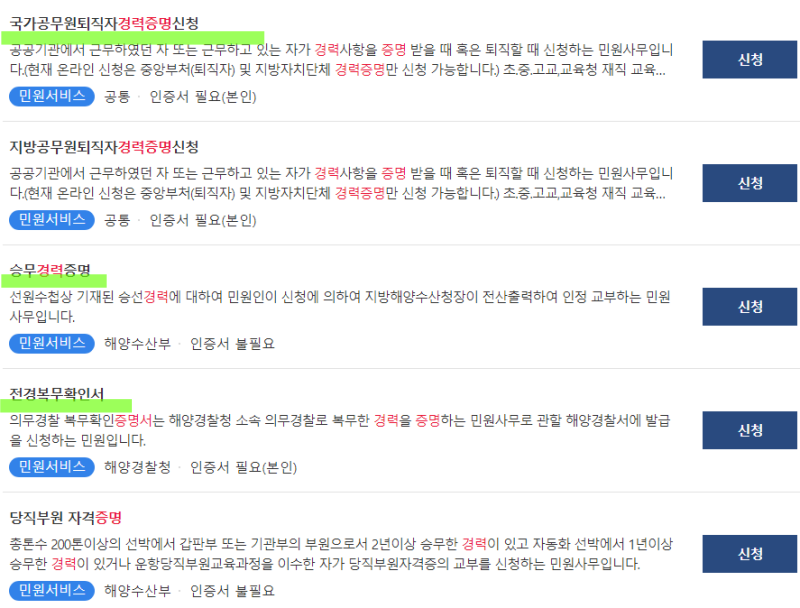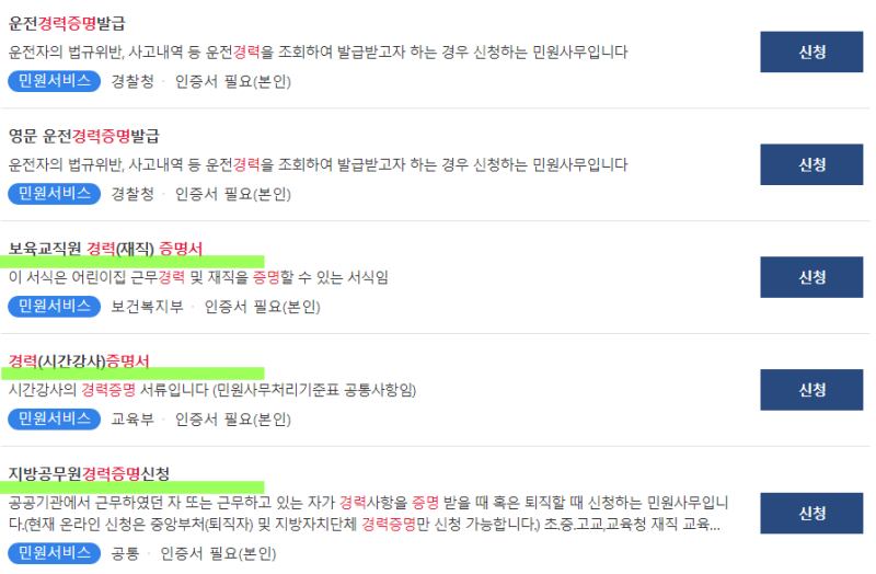 보육교사를 포함한 경력증명서를 신청하여 출력하실 수 있으며 승무경력증명서나 전경복무확이증명서 처럼 다양한 경력증명에 관한 민원 신청을 할 수 있습니다.