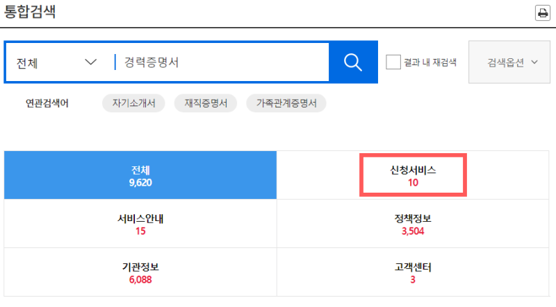 돋보기로 된 검색창 부분에 경력증명서를 입력합니다.