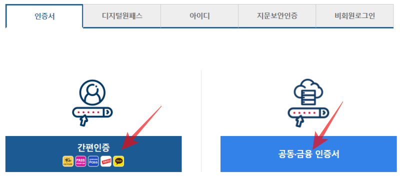 KB국민, 삼성패스, 페이코 등을 통한 간편인증 또는 공동/금융 인증서로 로그인이 가능합니다.