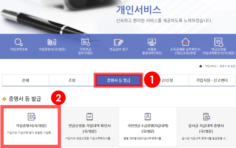 가로줄의 세번째 메뉴인 증명서 등 발급에 커서를 가져다 대고 가입증명서를 클릭합니다.