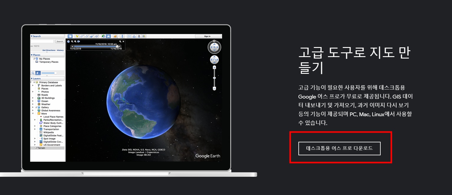 옆의 모바일용 Google 어스와 데스크톱용 Google 어스 프로는 구글어스 다운로드하여 설치하는 방법입니다.