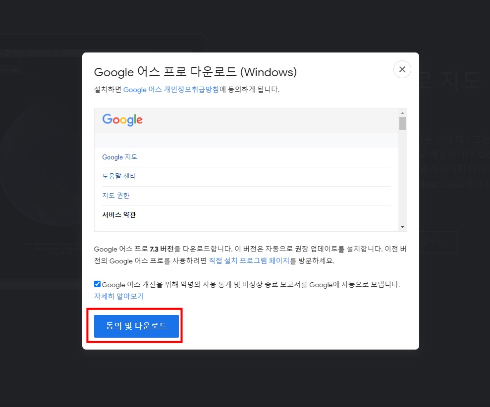 클릭하면 EXE 실행파일을 다운로드 받게 됩니다. 어스 프로를 다운로드하실 때에도 따로 구글 로그인은 필요하지 않으며 다운로드 시에는 개인정보 취급방침에 관한 동의를 해야 다운로드가 가능합니다.