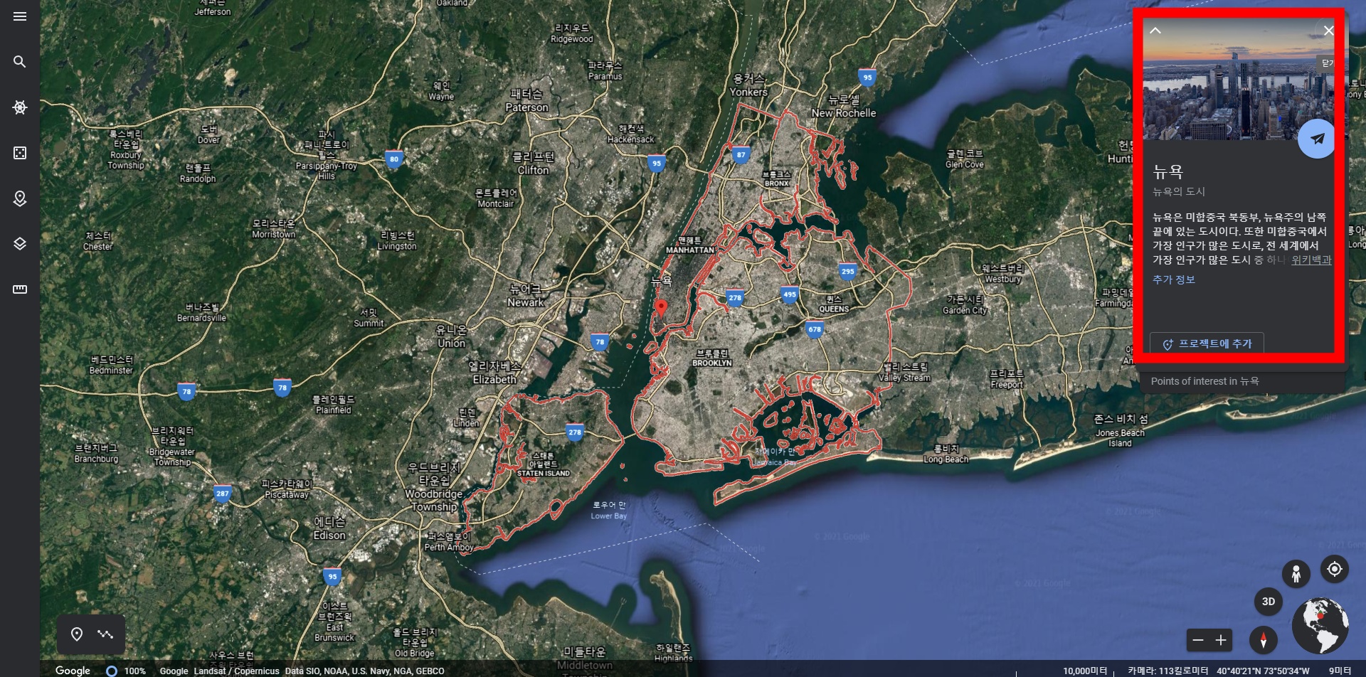 저는 아직 못가본 뉴욕을 검색해보았습니다. 뉴욕시 지역의 범위가 조금 큰 경우에 확대는 아래처럼 뉴욕시를 구분하는 곳까지 확대됩니다.