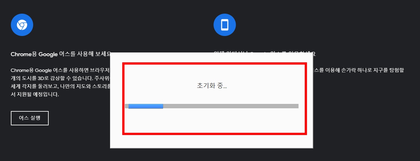 웹용 구글어스를 클릭하면 구글어스가 실행하기 까지 몇 초~ 1분 내외로 소요됩니다.