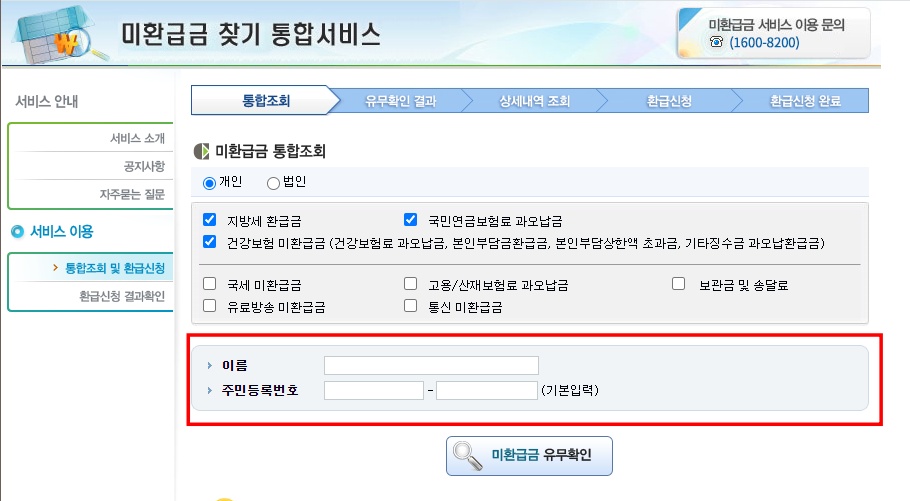 여러 미환급금을 한 번에 조회를 원하실 때 이용하기 좋습니다.