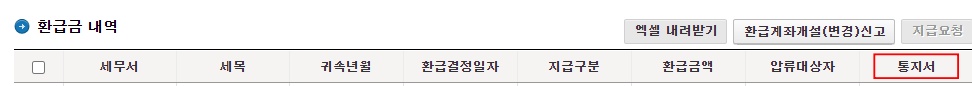 환급금 내역이 조회되며 통지서를 클릭하면 국세환급금통지서를 출력하실 수 있습니다. 이 통지서를 가지고 우체국에 방문하시면 환급금을 수령하실 수 있습니다.