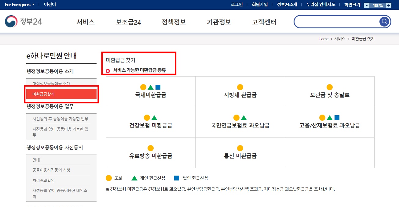 정부 24에서는 국세환급금뿐 아니라 국민연금보험료 과오납금, 건강보험 미환급금 등 다양한 미환급금을 조회할 수 있는 장점이 있습니다.