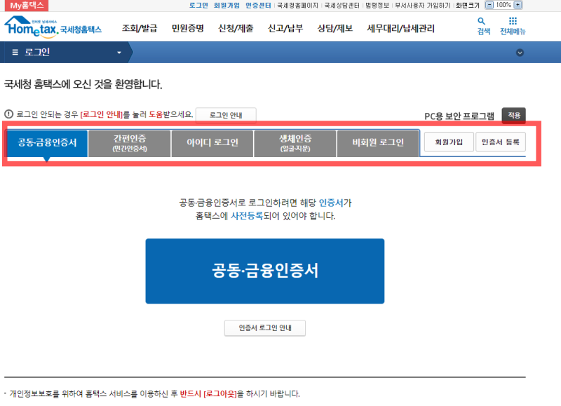 홈택스 로그인은 공동인증서 / 간편 인증 / 회원 로그인 등 다양한 방법이 있지만 회원 로그인을 한 후에도 인증서 로그인이 필요한 경우가 있어 인증서로 로그인하는 것을 추천합니다.