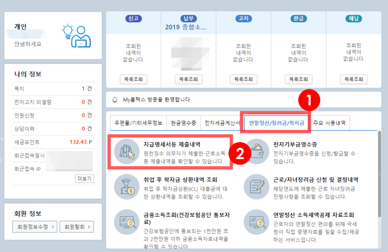 4번째 칸인 연말정산 부분에서 제일 처음에 있는 지급명세서 등 제출 내역을 클릭합니다.