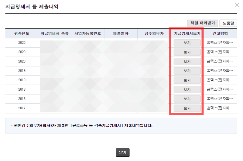 제출 내역을 클릭하면 4년 동안 원천징수내역 즉 지급명세서 내역이 조회됩니다.