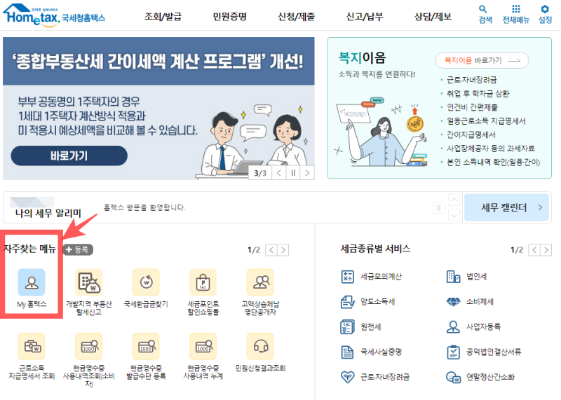 로그인이 되었다면, 사이트 왼쪽중앙에 있는 자주 찾는 메뉴에서 MY 홈택스를 찾아 클릭합니다.