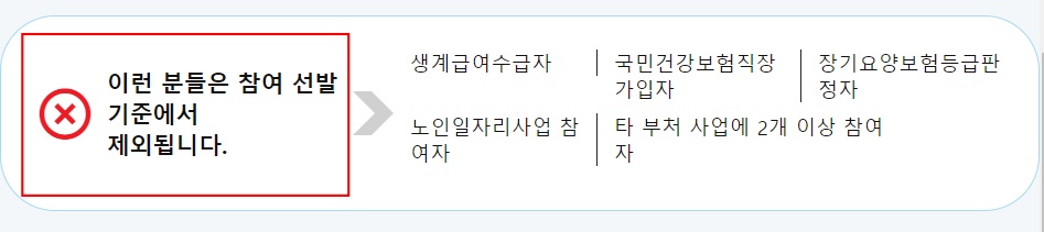 노인일자리 여기에서 참여선발 참여자격이 안되시는 분은 생계급여 수급자, 노인일자리 사업 참여자, 국민건강보험 직장가입자, 타 부처 사업에 2개 이상 참여자 분들은 선발에서 제외됩니다.