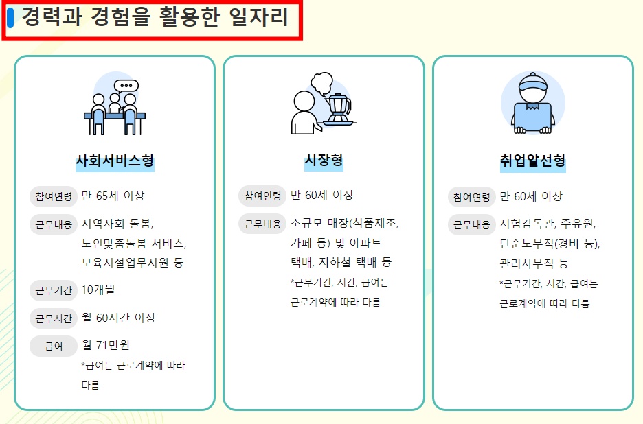 사회서비스형은 만 65세 이상이면 참여가능하며 지역사회 돌봄, 노인 맞춤 돌봄 서비스 등의 근무를 하며 활동기간은 10개월 근무시간은 월 60시간 이상으로 급여는 월 71만 원입니다.