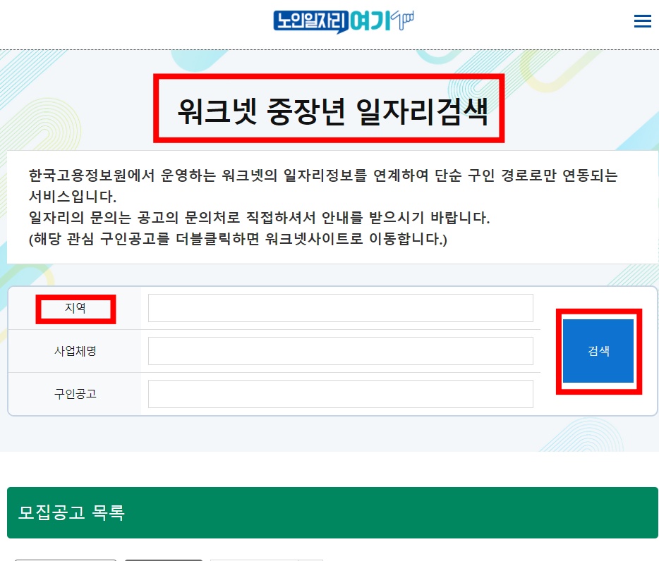 노인일자리 여기 홈페이지에서는 이러한 공익활동이나 사회활동 뿐 아니라 워크넷과 연동이 되어 워크넷에 올라온 중장년층 일자리도 검색하실 수 있습니다.