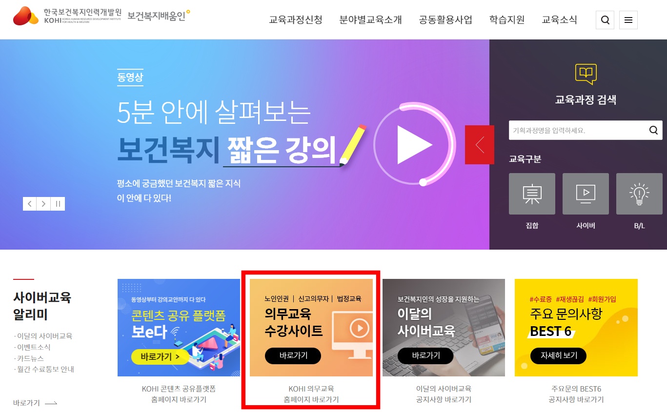 메인 홈페이지에 들어가시면 하단의 KOHI 사이버 교육 노인인권 교육을 클릭합니다.