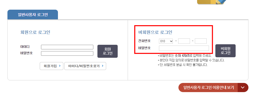 핸드폰번호와 비밀번호 4자리를 설정하면 로그인이 가능합니다.