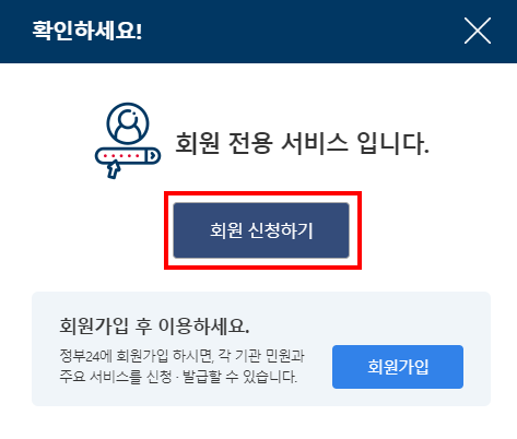 정부24를 통한 보건증 인터넷발급은 회원으로만 신청가능하므로, 회원이 아니신 경우에는 회원가입을 진행해주시기 바랍니다.