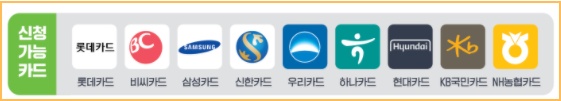 신한카드를 포함한 롯데 / 비씨 / 삼성 / 우리 / 하나 / 현대 / KB국민 / NH농협 총 9개의 카드사에서 신청 가능합니다.