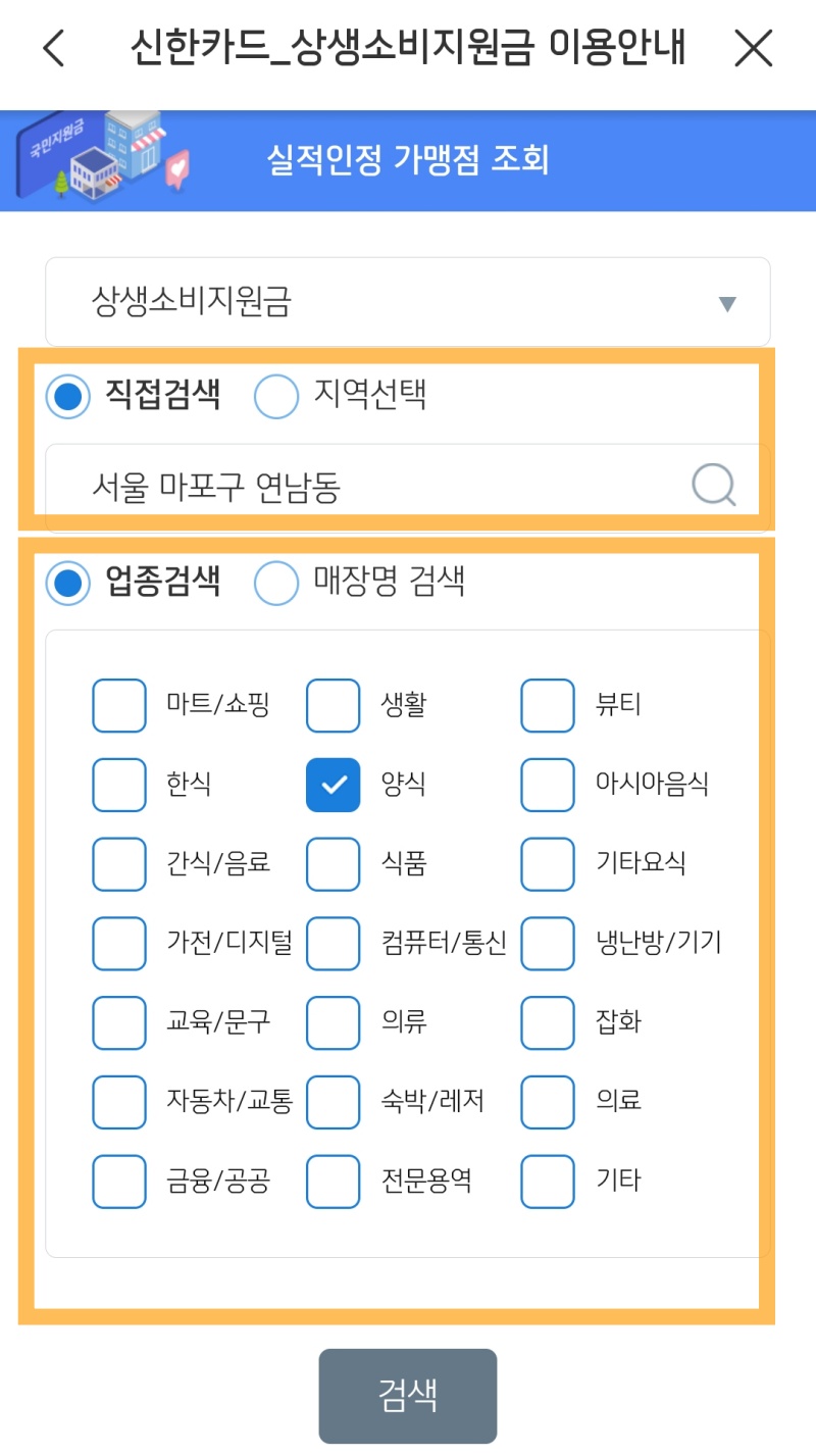 그리고 저는 신한카드를 전담카드사로 결정하고 신청할 예정인데, 신한 페이판 앱에서는 지역과 업종을 선택하면 실적 인정 가맹점을 쉽게 찾을 수가 있습니다.