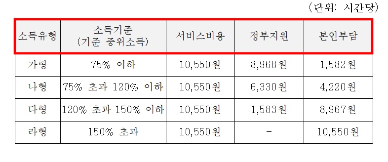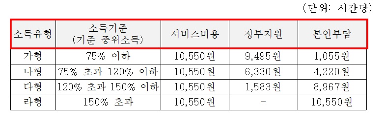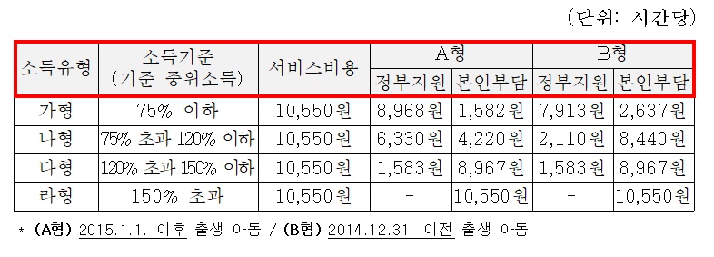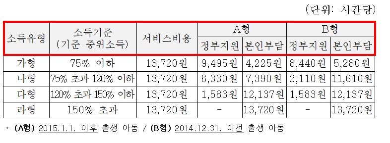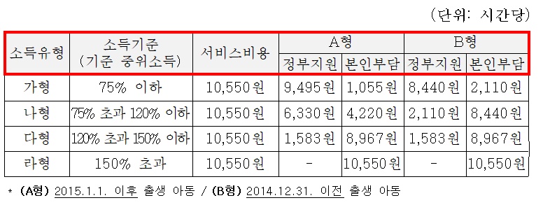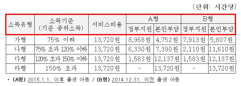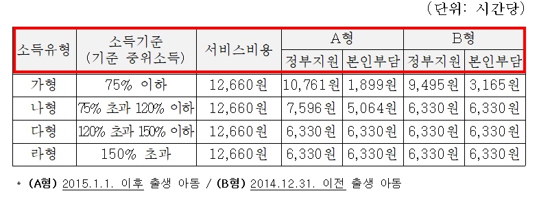 - 이용요금 : 서비스 "가~라" 유형과 미취학 아동, 취학 아동에 따라 본인 부담금이 시간당 1,899원~6,330원으로 다름