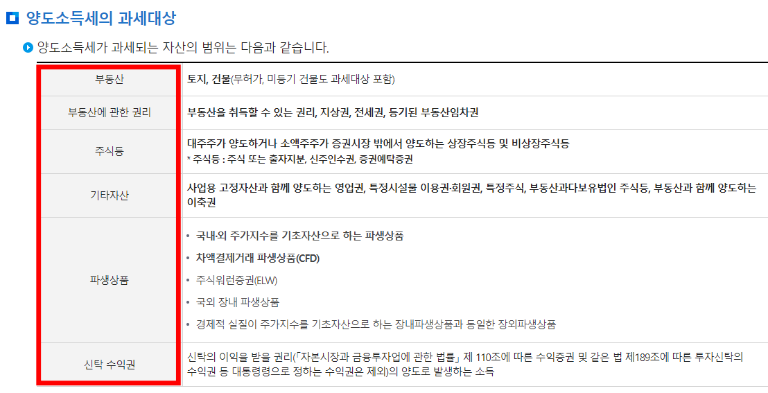 양도소득세 부동산 뿐 아니라 과세대상으로는 토지, 건물 등 부동산을 취득할 수 있는 권리, 등기된 부동산 임차권, 지상권, 전세권, 주식 등이 있으며 건물 중에서는 무허가와 미등기 건물도 과세대상에 포함됩니다.