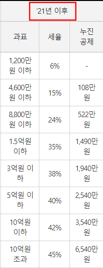 그리고 21년부터 양도소득세율 폭이 변경되었습니다. 기존까지는 과표가 5억원이 상한선이었는데 21년 이후부터는 10억 원이 새롭게 포함되었음을 알 수 있습니다.