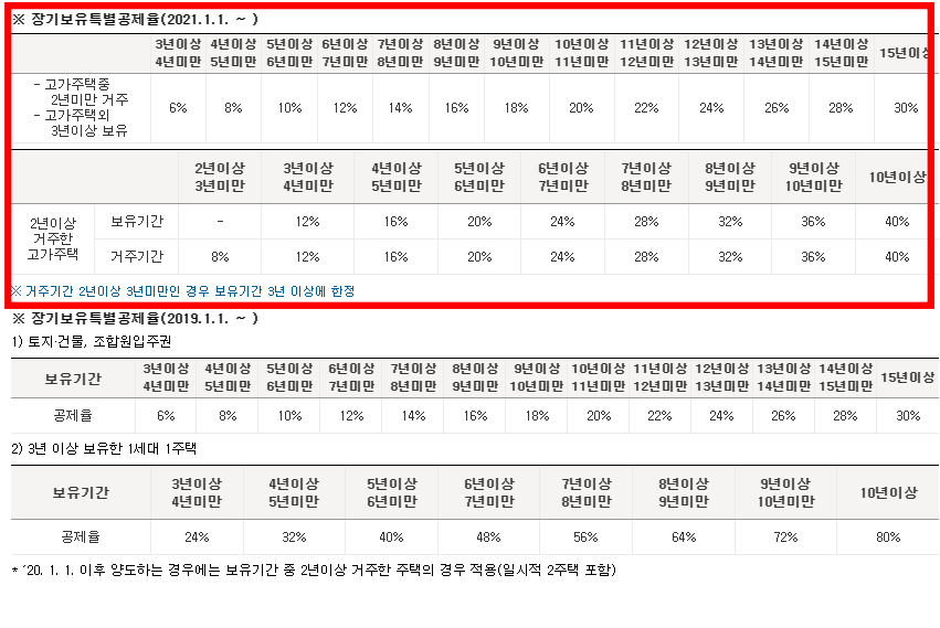 이전까지는 1세대 1 주택인 경우 2년 이상 거주하고, 10년 이상 보유를 한 상태에서 양도를 하면 최대 공제율인 80%를 공제받을 수 있었으나, 21년부터는 보유기간과 거주기간 두가지 조건을 모두 충족해야 하며 10년이상 거주하면서 10년이상 보유해야 80% 최대 공제율을 적용받을 수 있습니다.