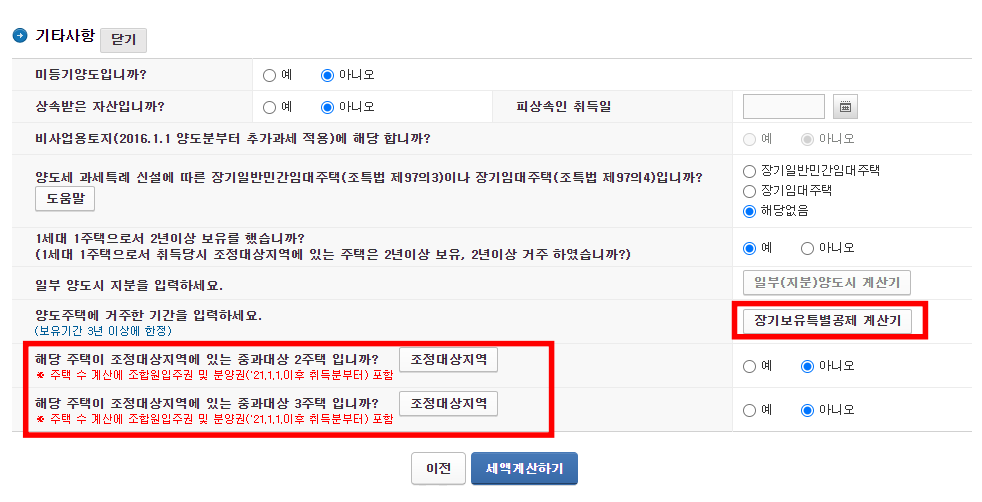 - 양도소득세 기타 사항 및 장기보유 특별공제 계산 정보 입력