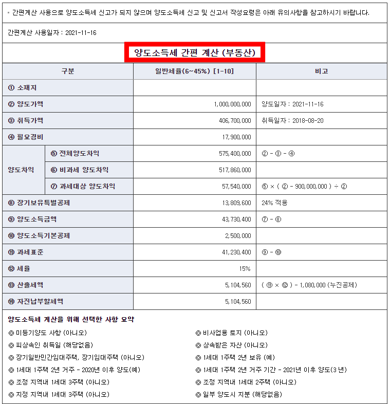 예시로 든 양도소득세 자동계산 내역을 보면 에서 10억 매매를 기준으로 하여 비과세 기준인 9억 원에서 1억 원을 초과하는 금액에 대해 과세대상 양도차익에 대한 양도소득세가 발생하였습니다.