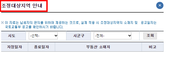 양도하는 주택이 조정대상지역이라면 조정대상지역 안내를 클릭하여 조정지역 여부를 정확히 확인할 수도 있습니다.
