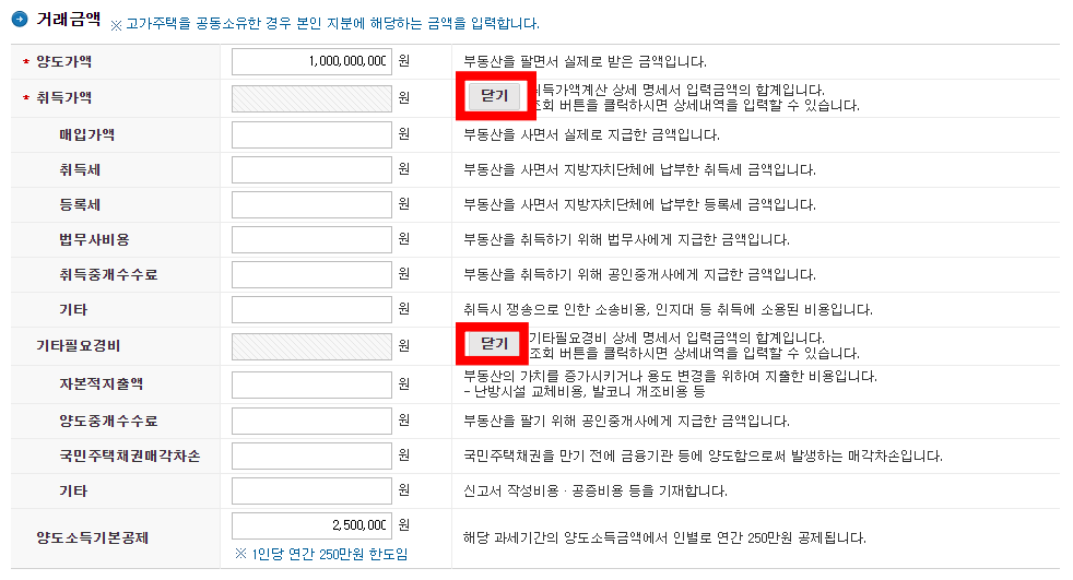 - 양도소득세 거래 세부 금액을 입력 합니다.