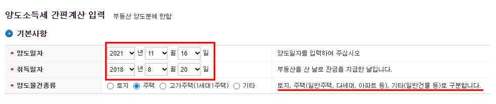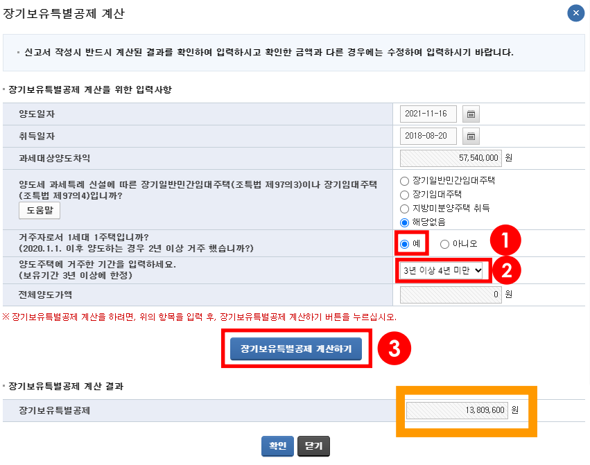 - 양도소득세 기타 사항 및 장기보유 특별공제 계산 정보 입력