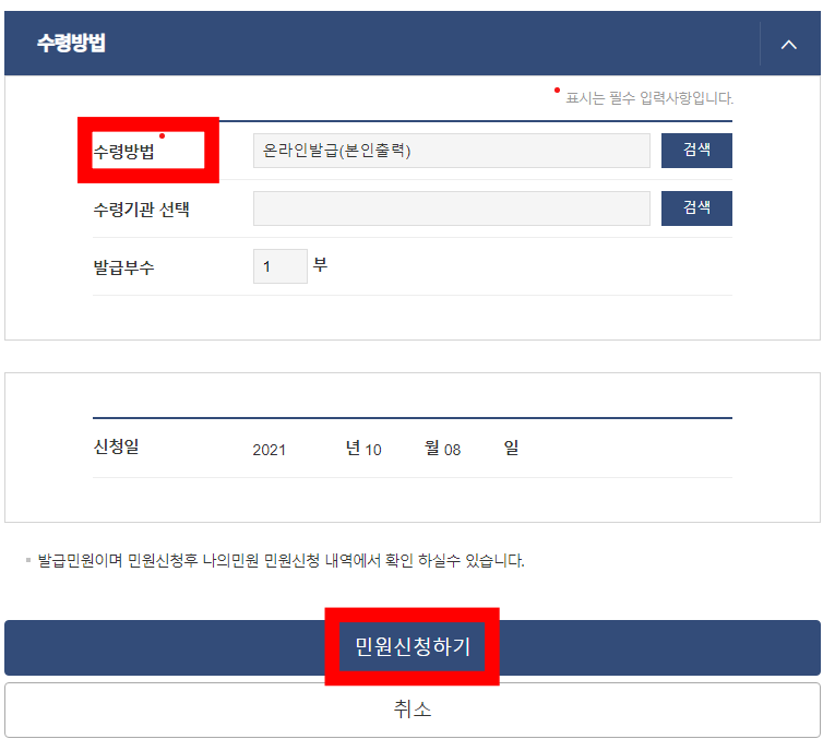 수령기관은 따로 선택 없이 공란으로 두고 발급 부수를 확인 후에 민원 신청하기를 누릅니다.