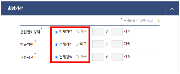 전체 경력을 선택하시거나 희망기간 ( ex : 5년 0개월) 을 입력하시면 됩니다.