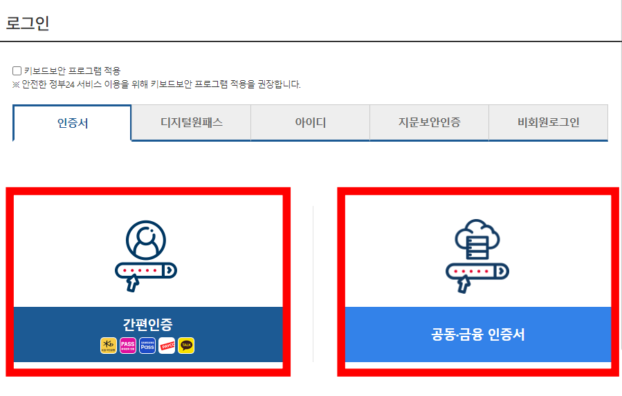 정부 24 로그인은 금융인증서와 같은 공동 인증서 또는 카카오, 페이코, 삼성 패스와 같은 간편 인증 중 하나로 이용 가능합니다.