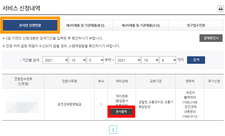 서비스 신청 내역 결과가 나오면 처리상태 부분에서 문서 출력을 누릅니다.