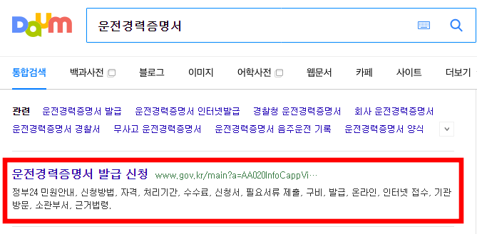 포털사이트에서 '운전경력증명서'를 검색하면 정부 24 사이트에 운전경력증명서 발급 신청 부분으로 넘어갑니다.