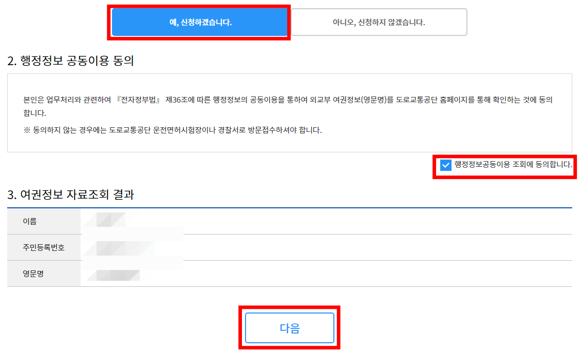 면허정보는 자동적으로 기재되어 나오며 맞는지 확인합니다.