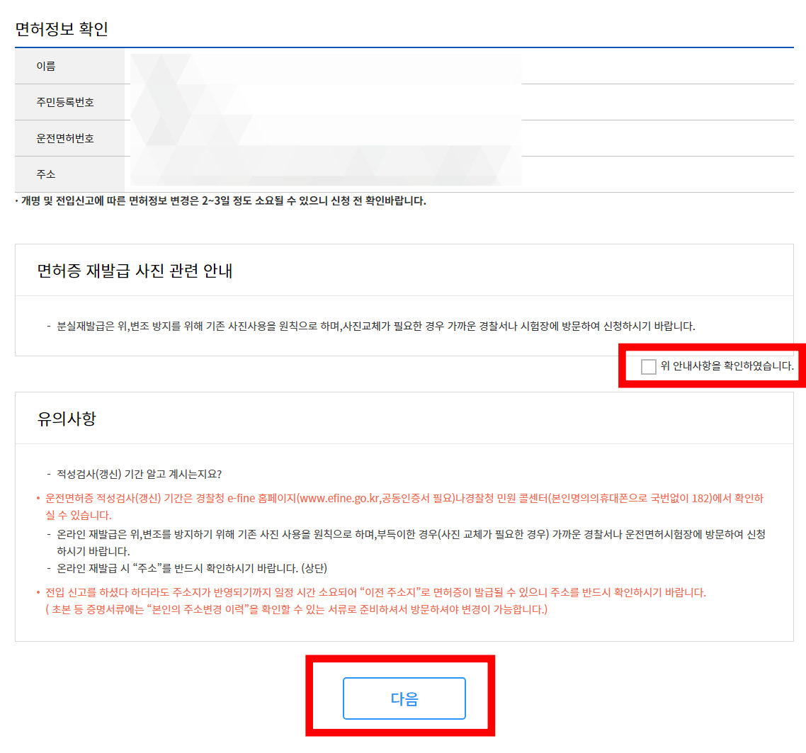 면허정보는 자동적으로 기재되어 나오며 맞는지 확인합니다.