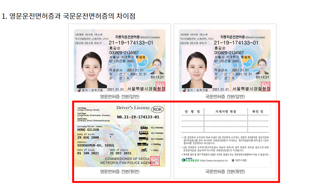 영문 운전면허증은 국문 운전면허증과 앞면은 동일하며 뒷면에 해외에서 사용하기 편하게 영문으로 운전면허 내용이 표기된 면허증입니다.