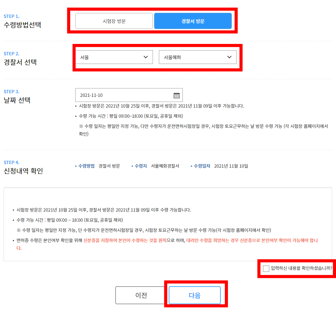 방문가능일자가 계산되어 나오는 점이 편했으며, 시험장과 경찰서 중 일정에 맞춰 원하시는 날짜에 예약하시면 됩니다.
