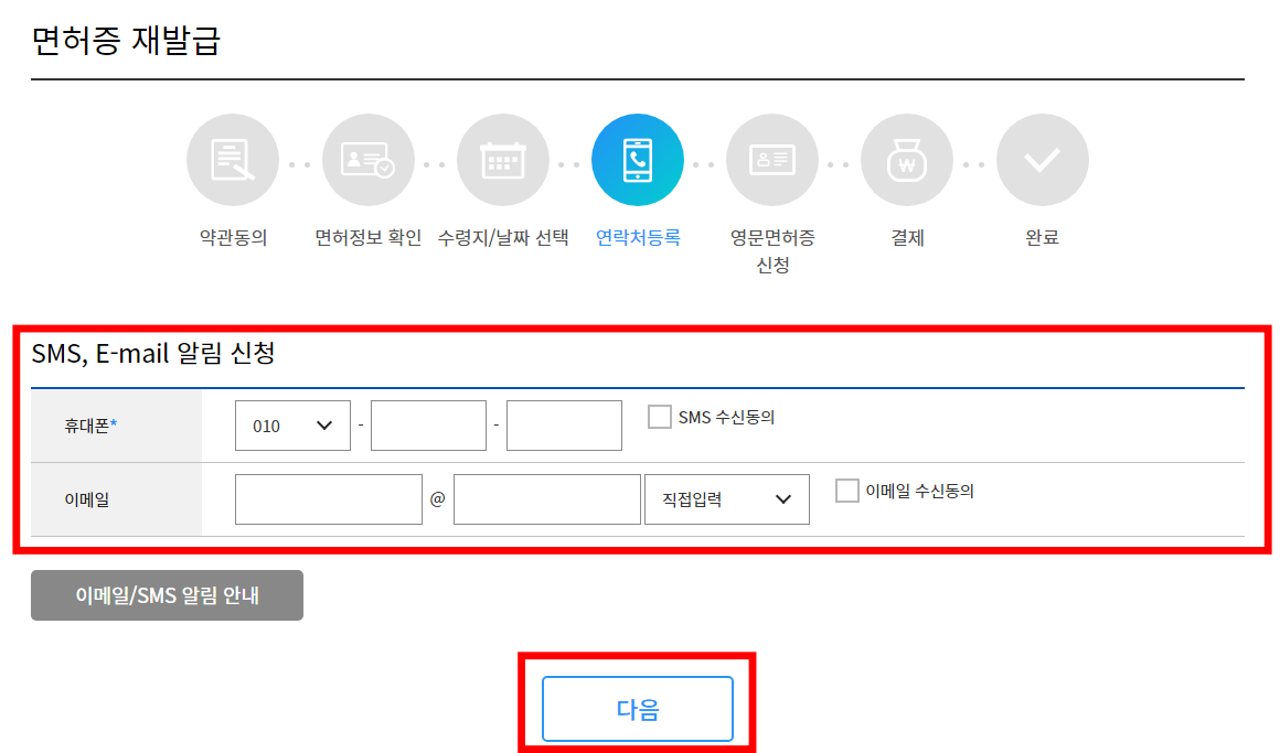 인증을 완료하면 운전면허증 재발급 신청 절차가 나옵니다.