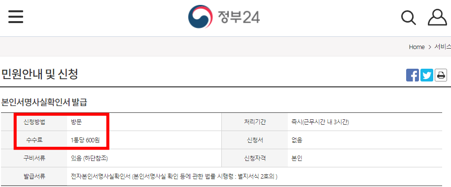 본인서명사실확인서 역시 관할 지자체 방문으로만 진행되며 구비서류로는 신분증이 필요하며 수수료는 600원입니다.