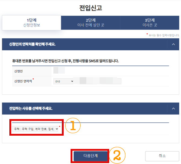 전입신고 인터넷 신청 시 1단계는 신청인정보 입력단계이며 전입하는 사유를 선택후 다음단계를 눌러줍니다.